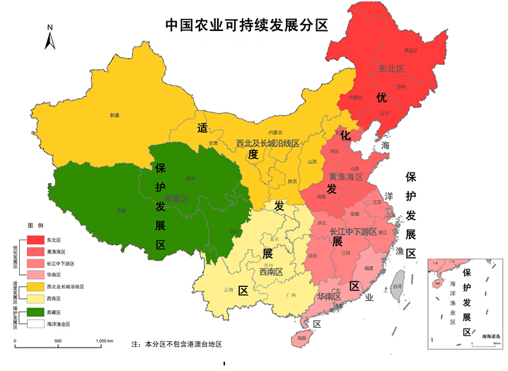 针对各地农业可持续发展面临的问题,综合考虑各地农业资源承载力、环境容量、生态类型和发展基础等因素,将全国划分为优化发展区、适度发展区和保护发展区。按照因地制宜、梯次推进、分类施策的原则,确定不同区域的农业可持续发展方向和重点。